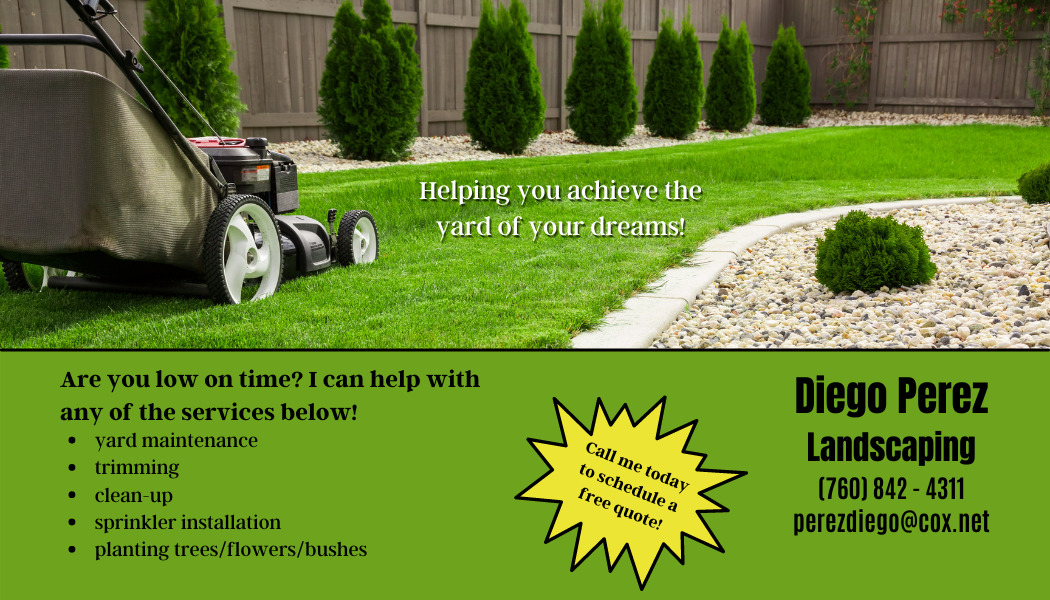 Diego Perez Landscaping – Mr. Perez has been a landscaper for many years, primarily in the North County areas of San Diego County.